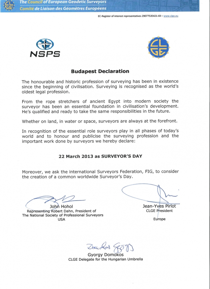 Але вже у 2013 році під час засідання Генеральної Асамблеї CLGE на Європейській космічній виставці в Будапешті (Угорщина) президентом CLGE Жаном-Івом Пірло, представником Національного товариства професійних землемірів США(NSPS) Джоном Хохолом та національним делегатом Угорщини Дьйордем Домокосом було підписано Будапештську декларацію, що закликала Міжнародну федерацію геодезистів (FIG) встановити Всесвітній день землеміра.