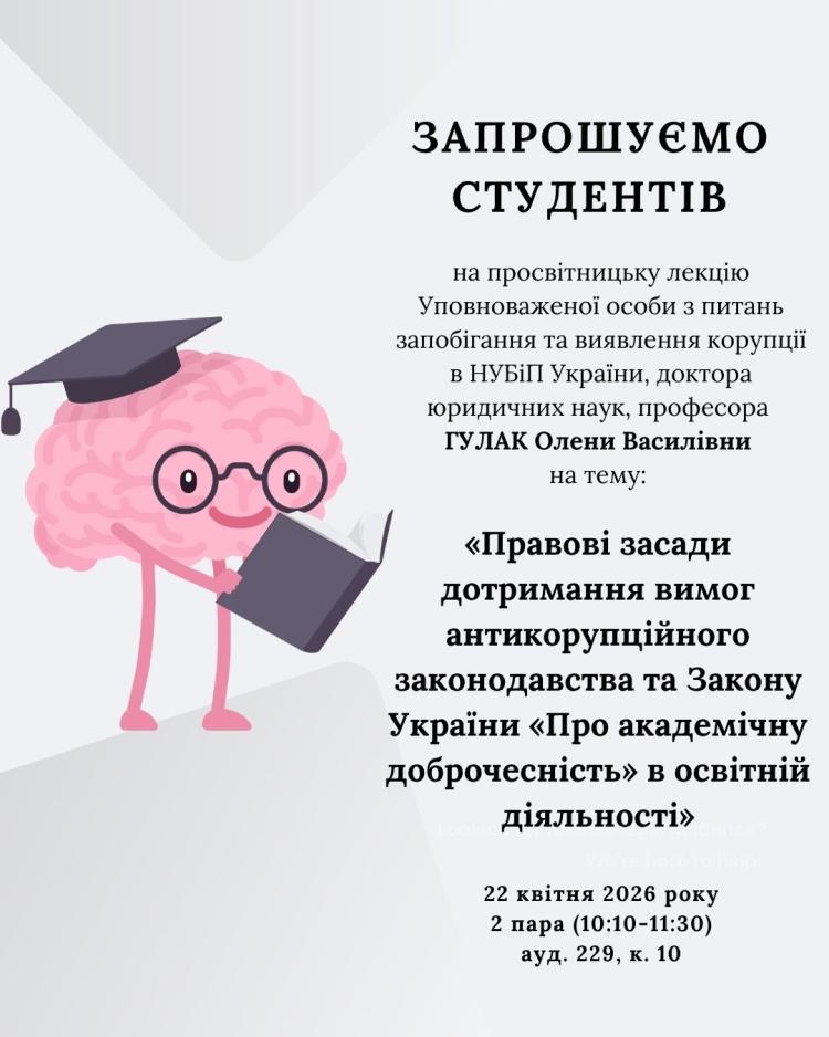 22.04.2026 р. о 10.10 запрошуємо здобувачів вищої освіти на просвітницьку лекцію Уповноваженої особи з питань запобігання та виявлення корупції в НУБіП України, доктора юридичних наук, професора ГУЛАК Олени Василівни на тему: «Правові засади дотримання вимог антикорупційного законодавства та Закону України «Про академічну доброчесність» в освітній діяльності»