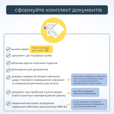 Представник приймальної комісії перевірить наявність необхідних для реєстрації документів та правильність їх оформлення.