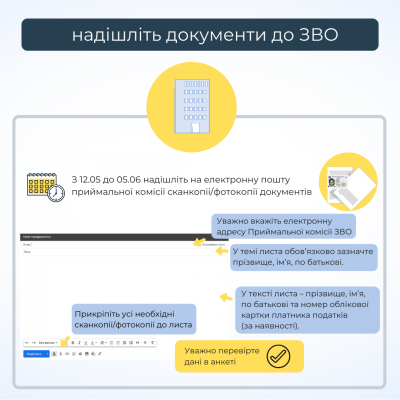 2.Надішліть на електронну адресу приймальної комісії скановані копії або фотокопії реєстраційних документів.