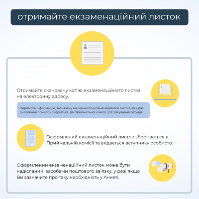 Оформлений екзаменаційний листок можна отримати особисто, звернувшись до приймальної комісії, або поштовим зв’язком, якщо ви зазначили про таку необхідність у заяві-анкеті.