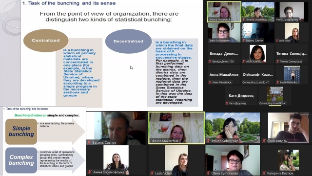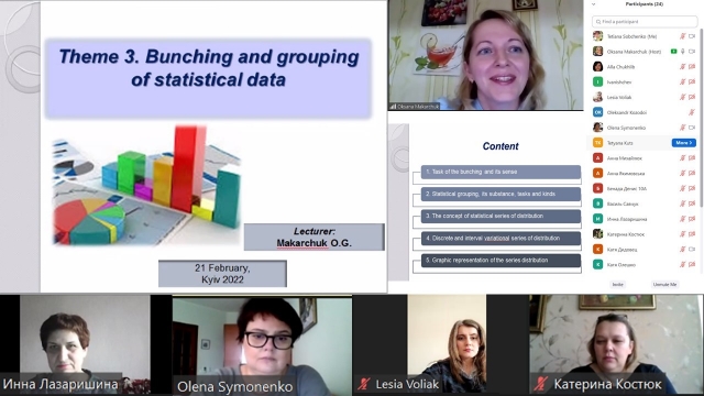 21 лютого 2022 року кандидат економічних наук, доцент кафедри статистики та економічного аналізу Макарчук Оксана Григорівна провела відкрите лекційне заняття англійською мовою в онлайн-режимі з дисципліни «Статистика» (Statistics) на тему: «Зведення і групування статистичних даних» (Bunching and grouping of statistical data) для здобувачів першого (бакалаврського) рівня вищої освіти 1 курсу 2 групи спеціальності «Економіка».