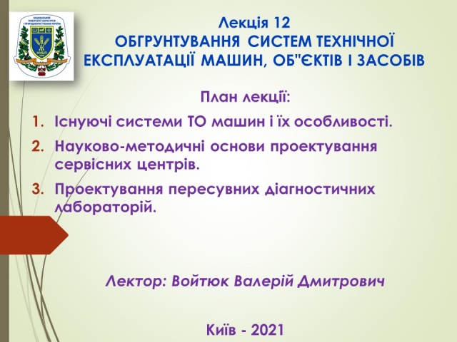 25 листопада 2021 року відбулася відкрита лекція професора кафедри технічного сервісу та інженерного менеджменту імені М. П. Момотенка Валерія Войтюка з навчальної дисципліни “Теоретичні основи технічної експлуатації машин” на тему «Обґрунтування систем технічної експлуатації машин, об’єктів і засобів». На лекції були розглянуті такі питання, як існуючі системи технічної експлуатації машин і їх особливості, науково-методичні основи проектування сервісних центрів, проектування пересувних діагностичних лабораторій. Лектор зробив акцент на тлумаченні переваг і недоліків існуючих систем технічної експлуатації машин, а також дав вичерпну інформацію щодо обґрунтування об’єктів і засобів технічної експлуатації машин в період їх виробничої експлуатація в різних умовах господарювання.