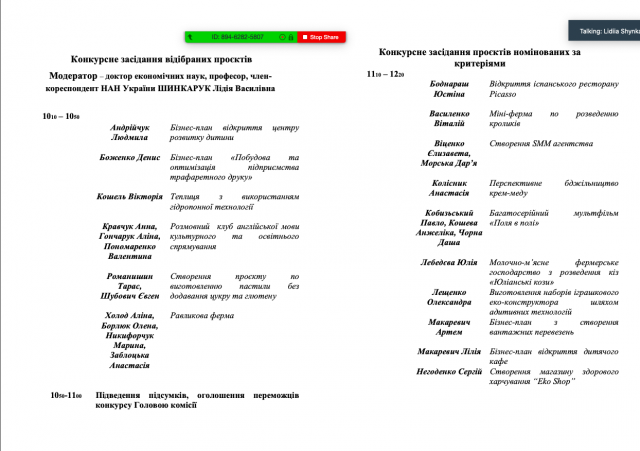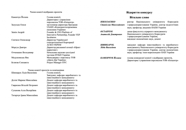 Модератор конкурсу, завідувач кафедри виробничого та інвестиційного менеджменту, член-кореспондент НАН України, доктор економічних наук, професор Шинкарук Лідія Василівна наголосила на головній меті конкурсу, яка полягає в реальній можливості молоді реалізувати свій потенціал через презентацію професіоналам у сфері бізнесу своїх ідей, а роботодавцям не тільки справедливо оцінити представлені проєкти, а й дати їм можливість бути реалізованими. Лідія Василівна побажала молоді успіху та представила членів журі, серед яких Йолана Каменчук (Голова конкурсної комісії, директорка з управління персоналом ТОВ «Епіцентр»), Залуська Олеся (заступниця директора Програми USAID «Конкурентоспроможна економіки України»), Заікін Андрій (Founder & CEO Platform of Innovative Partnership, Founder YEP Incubators), Сенчило Олександр (Директор Української електротехнічної Корпорації АСКО-УКРЕМ), Моргун Дмитро (Директор рекламної агенції «Ефект маркетинг»), Отченашко Володимир (Начальник науково-дослідної частини НУБіП України), Бєляєва Єлизавета (Project Manager ITFC). Всі члени журі звернулися з привітальним словом, побажали кожному успіху та наголосили на важливості проведення заходів такого рівня.