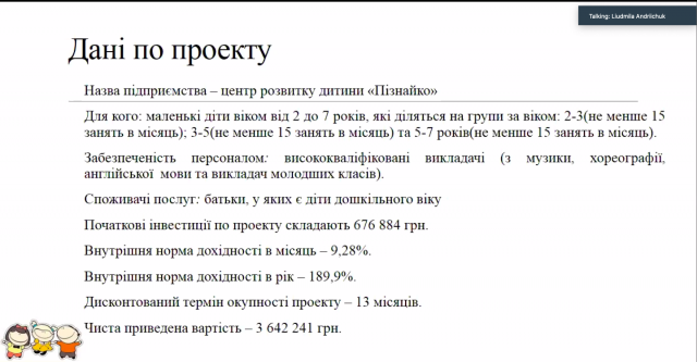Проект з відкриття центру розвитку дитини (Л.Андрійчук), який виборов ІІІ місце, визначається ґрунтовним аналізом інвестиційної привабливості та сучасністю, бо якісна освіта і розвиток дітей – актуально в любий час.