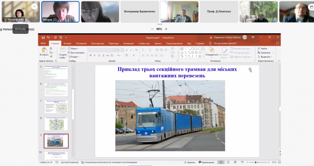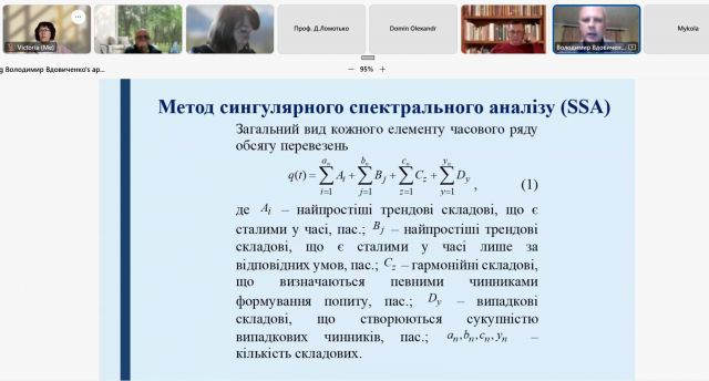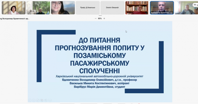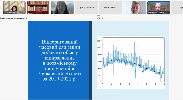 Вдовиченко В.О., професор Харківського національного автомобільно-дорожнього університету, також залишився і працює в рідному місті. Проведений аналіз часового ряду відправлень у позаміському сполученні Черкаської області та отримані залежності дають можливість прогнозувати попит у позаміському пасажирському сполученні і вже зараз планувати, а в деяких випадках перебудовувати перевезення в Харківській та інших областях. Цікаво було почути про використання тролейбусів з динамічною підзарядкою і автономним ходом, які використовуються в Харкові. Це яскравий приклад того, що в цей важкий час розрухи і постійних бомбардувань міський транспорт перелаштовується і відповідає вимогам, закріпленим в Європейському зеленому курсі та Цілях сталого розвитку.