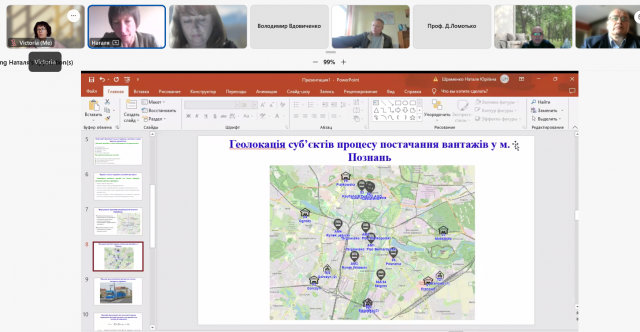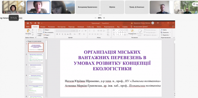 Тенденції розвитку екологістики були висвітлені в доповіді професора Познаньського технологічного університету та Національного університету "Львівська політехніка" Шраменко Н.Ю. Інформація про трьохсекційні трамваї для вантажних перевезень в місті Познань зацікавила всіх і надихнула до обговорення варіантів їх застосування в умовах Києва. Розглядалися також переваги та недоліки такого виду вантажних перевезень та можливості сучасного електротранспорту в сприянні активній міській мобільності.