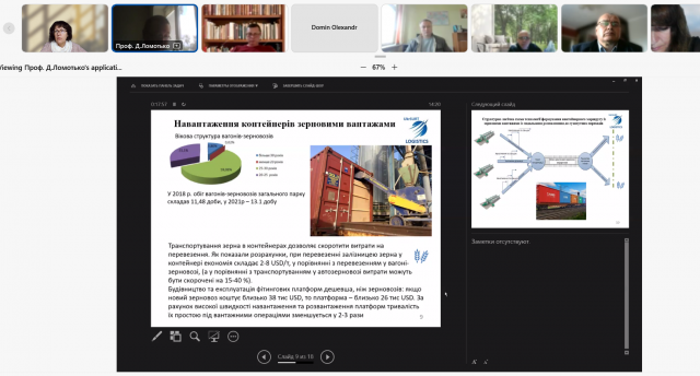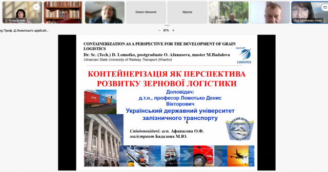 Професор Українського державного університету залізничного транспорту Ломотько Д.В. представив своє бачення напрямків розвитку зернової логістики. Оскільки Україна продовжує нарощувати свій експортний потенціал, основна увага в доповіді була приділена контейнерним перевезенням зерна залізницею. Питання організації мультимодальних перевезень зернових вантажів, особливості їх навантаження, розміщення пунктів перевантаження викликали інтерес аудиторії. Доповідач звернув увагу на першочергові проблеми, що проявилися в період військових дій при перевезеннях урожаю і потребують врегулювання: це тривалість черги на перетині кордону і як результат збільшення простоїв і ціни. Одразу були запропоновані шляхи вирішення: застосування контейнерів, що дасть змогу зменшити логістичні витрати зернотрейдера, скоротити тягові витрати.