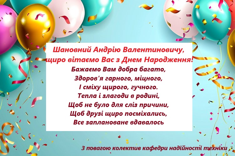Привітання з Днем Народження завідувача кафедри надіності техніки, к.т.н., доц. Новицького Андрія Валентиновича 13 грудня 2025 року