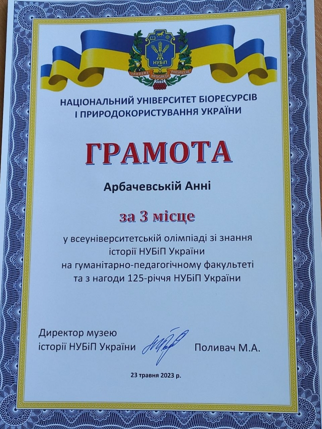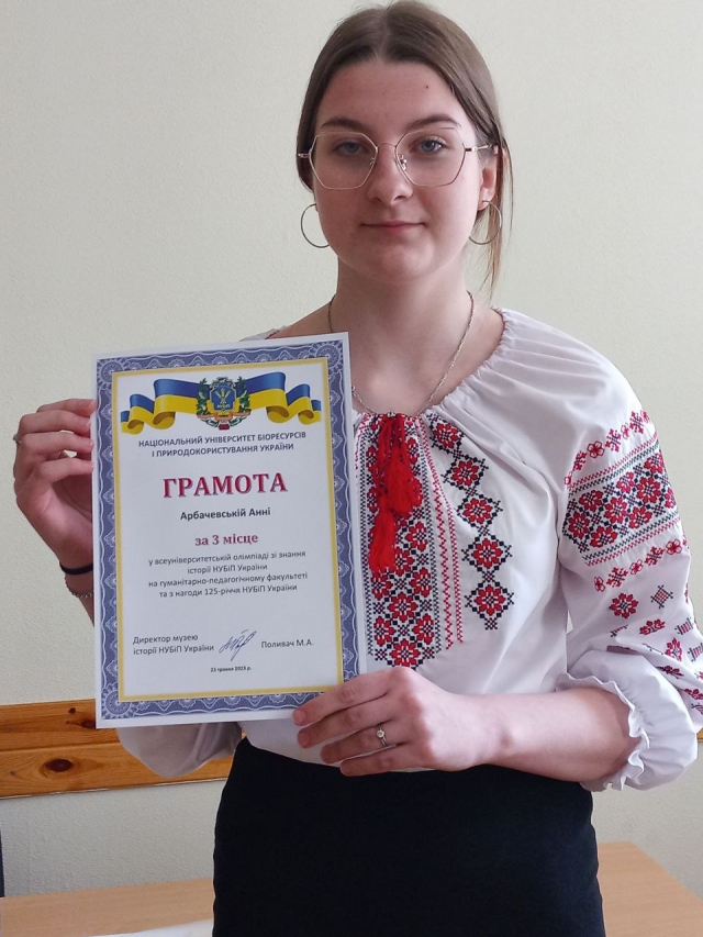 Вітаємо студентку першого курсу, переможницю олімпіади з історії Національного університету біоресурсів і природокористування, Арбачевську Анну, яка зайняла ІІІ місце серед всіх учасників гуманітарно-педагогічного факультету!