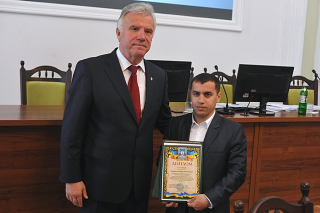 Ректор університету Станіслав Ніколаєнко вручив диплом члену гуртка "Дорадник" Дмитру Холявко.