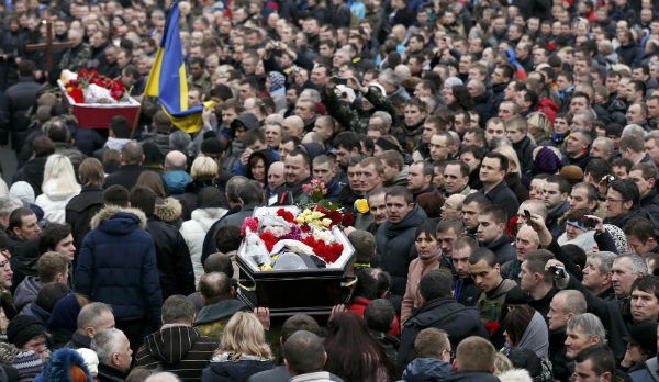Майдан, 21 лютого 2014 року. На Майдані прощаються із загиблими учасниками протесту. Крізь натовп гроби підносять до сцени, після молитви та розповіді про загиблого, скандують «Герой!» та «Герої не вмирають!». Періодично звучить пісня «Плине кача по Тисині».