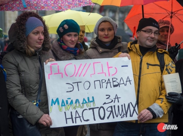 Десятки людей на Майдані відкрили парасольки, виступаючи на підтримку телеканалу «Дождь», який чи не єдиний правдиво висвітлював події Євромайдану. Через свою позицію телеканал "Дождь" зазнав утисків з боку російської влади.