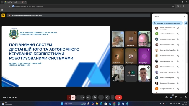 Потім виступив аспірант кафедри Богдан ОСТРОУШКО (науковий керівник – доцент Семен ВОЛОШИН), із доповіддю на тему «Порівняння систем дистанційного та автономного керування безпілотними роботизованими системами». Виступ супроводжувався жвавою дискусією.
