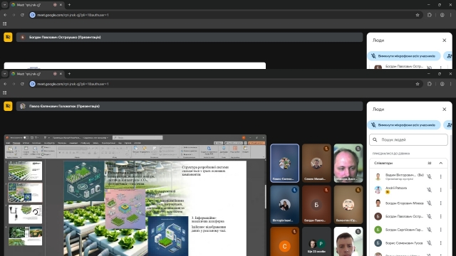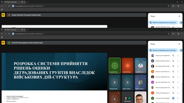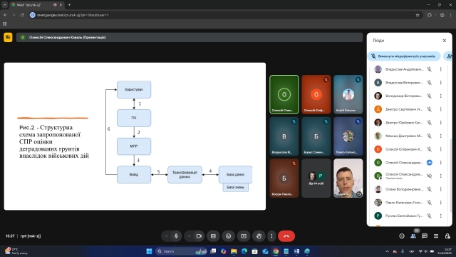 Потім слово було надане аспіранту Олексію КОВАЛЮ, із доповіддю на тему «Розробка системи прийняття рішень оцінки деградованих ґрунтів внаслідок військових дій - структура» (науковий керівник – професор Ігор БОЛБОТ). Доповідь викликала жваві дискусії.