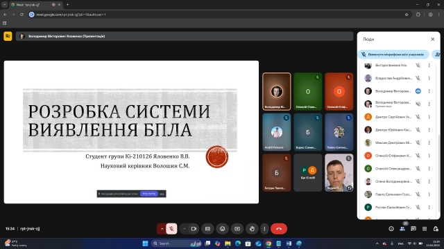 Завершальний виступ був здійсненим студентом Володимиром ЯЛОВЕНКО, на тему «Розробка системи виявлення БПЛА» (науковий керівник – доцент Семен ВОЛОШИН). Учасниками було задано чимало питань доповідачеві. Особливо при цьому відзначився магістрант Валентин ВЕРНИГОРА.