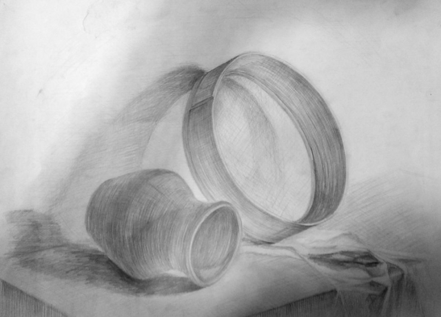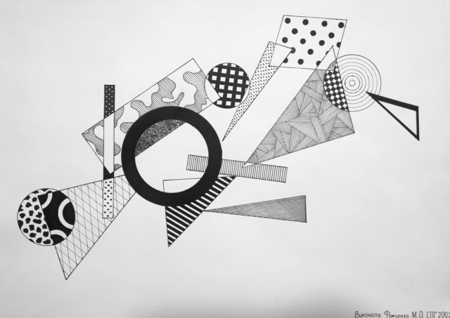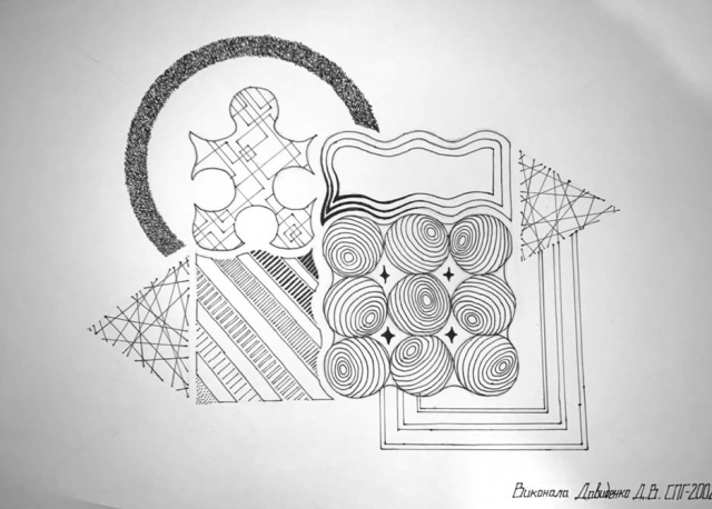 Практичними роботами навчального курсу передбачені завдання від площинної композиції до побудови об’ємно-просторового зображення із використанням різних матеріалів – графітні олівці, акварельні фарби, лайнери та маркери.