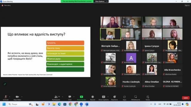 Лекцію «Публічні виступи та самопрезентація» провела третього дня Алла Кравченко, доцентка кафедри філософії та міжнародної комунікації Національного університету біоресурсів і природокористування України. Спікерка висвітлила сучасні підходи до подолання психологічних бар’єрів щодо підготовки та здійснення публічних виступів лідерками; узагальнила матеріал щодо способів розвитку навичок публічних виступів.