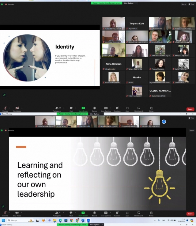 Спікеркою першого дня була Світлана Романцова, доцентка кафедри кримінального права Інституту права Львівського державного університету внутрішніх справ. Пані Світлана презентувала матеріал на тему: «Шлях до розширення прав і можливостей жінок та жіночого лідерства. Виклики гендерних стереотипів у вищій школі», який викликав активне обговорення та значний інтерес учасниць. Крім того, всіх захопила командна вправа «Скріпочка», де учасники співпрацювали та мали нагоду обговорити матеріал та прокоментувати свої думки з теми дискусії. Другого дня говорили про «Лідерські навички» з Сарою Кардей, професоркою Університету Редінгу. Пані Сара запропонувала учасницям Літньої школи долучитися до обговорення важливих питань щодо становлення лідерства, необхідних особистісних рис й навичок для розкриття власних сильних сторін та самореалізації; було також обговорено типи лідерства та особливості реалізації лідерських амбіцій, їх факторів у академічному середовищі. Учасниці проаналізували сучасні підходи для формування лідерських навичок, систематизували власний досвід досягнень та вибудували мотиви для лідерства. На завершення спікерка запропонувала домашнє завдання, яке допоможе виділити особистості та події, які вплинули на розуміння лідерства учасницями школи.
