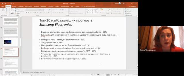 Розглянули Топ-20 найбажаніших прогнозів Samsung Electronics:будинки з автоматичним прибиранням за допомогою роботів; імпланти для спостереження за станом здоров’я і перекладу з будь-якої мови; повітряні таксі і автобуси-безпілотники; 3-D-друк органів; подорожі на ракетах через ближній космос; роботизовані технології в хірургії та лікарській практиці; віртуальні помічники для підтримки здоров’я; чутливі до торкання ігрові костюми для повного занурення у віртуальну реальність; вертикальні ферми на фасадах будівель; готелі в космосі; підводні магістралі; інтерактивний кінематограф, фізична присутність в VR-контенті; доступний фастфуд з комах; землехмарочоси (перевернуті хмарочоси, що заглиблюються під землю); повітряні спортивні матчі на ховербордах в стилі квідичу; вічне життя зі спогадами в хмарному сховище; віртуальні мультисенсорні туристичні поїздки; їжа за індивідуальним планом, розробленим за допомогою імплантованих сенсорів; пряме підключення мозку до інтернету; спрямована через мозок передача телетрансляцій і фільмів за допомогою оптоелектронних пристроїв.