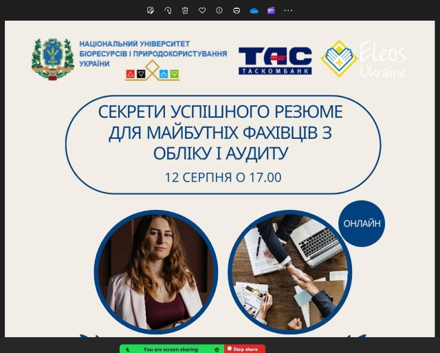 Даним вебінаром зацікавилися як учасниці курсів «Бухгалтерський облік: від теорії до практики» і «Публічні закупівлі в умовах воєнного стану» (організовані ГО «Елеос-Україна» в НУБіП України), так і здобувачі першого (бакалаврського), другого (магістерського) та третього (освітньо-наукового) рівнів вищої освіти спеціальності 071 «Облік і оподаткування». Доєдналися до вебінару і науково-педагогічні працівники кафедри обліку та оподаткування, гаранти освітніх програм.До учасників заходу із вітальним словом звернувся завідувач кафедри обліку та оподаткування Володимир Литвиненко, який наголосив на важливості даного заходу, можливостях детально розглянути, як правильно заповнити кожен розділ та які акценти розставити, щоб резюме кандидата було першим у списку рекрутера на співбесіду. Адже колектив кафедри вважає, що результатом навчання є успішне працевлаштування випускників.