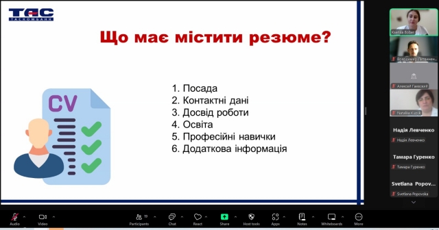 Ксенія надала особливі поради учасникам заходу щодо написання «крутого» резюме, зокрема й за відсутності досвіду роботи.Учасники вебінару взяли участь в обговоренні дискусійних питань щодо володіння Hard-skills і Soft-skills, можливостей подачі резюме з урахуванням професійного досвіду, навичок і знань, отриманих із лекцій, тренінгів, семінарів, курсів.