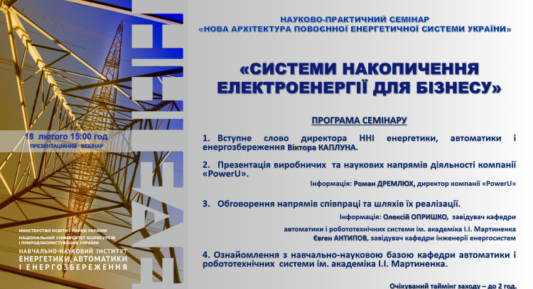 Запрошуємо усіх бажаючих на семінар «СИСТЕМИ НАКОПИЧЕННЯ ЕЛЕКТРОЕНЕРГІЇ ДЛЯ БІЗНЕСУ» від компанії PowerU. Зустріч за посиланням