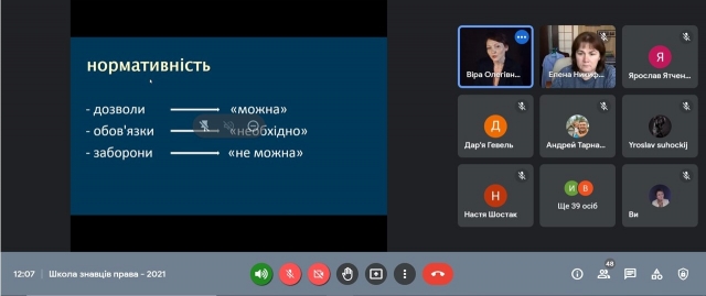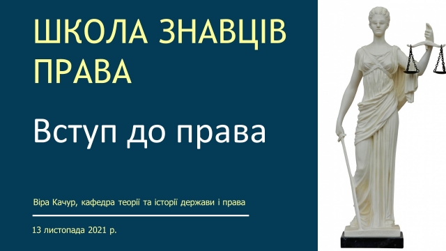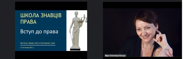 13 листопада 2021 р. до першого онлайн-вебінару «Вступ до права» долучилося 46 учасників. Спікеркою виступила завідувачка кафедри ТІДП Віра Качур, яка протягом заявленого часу зуміла коротко розповісти присутнім про те, що сьогодні включає в себе поняття «право» - можливості суб’єкта та різновид соціальних регуляторів.