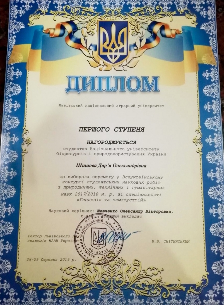 У II турі Всеукраїнського конкурсу студентських наукових робіт за напрямом «Геодезія та землеустрій» презентували результати своїх наукових досліджень в галузі геодезії, картографії та землеустрою 45 студентів з 26 вищих навчальних закладів України. З приємністю відзначимо, що науково-дослідна робота Дар'ї Шишової, результати якої вона доповіла блискуче, отримала високу оцінку і була відзначена дипломом переможця (I місце). Інші наукові роботи студентів факультету землевпорядкування були також гідно представлені комісії Конкурсу і лише трішки не дотягнули до призового місця, через що були відзначені заохочувальними дипломами.