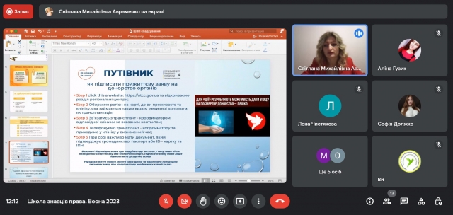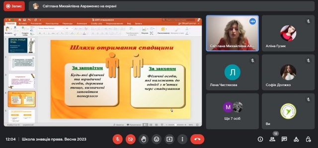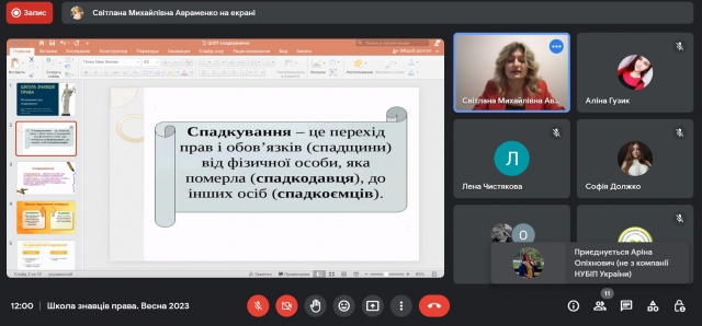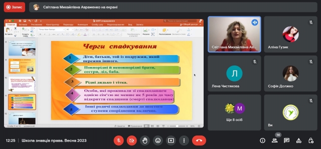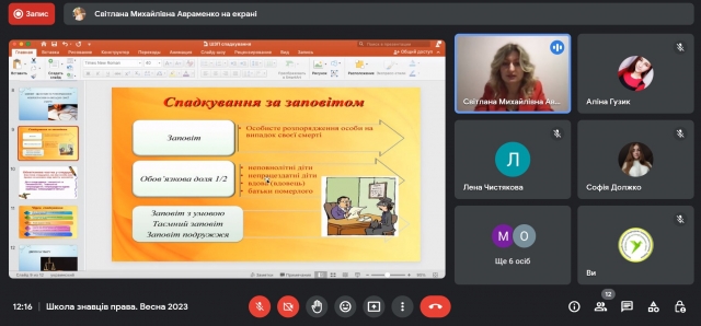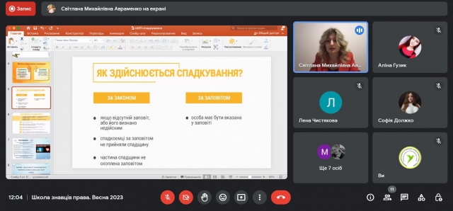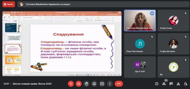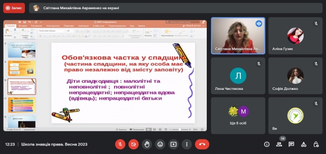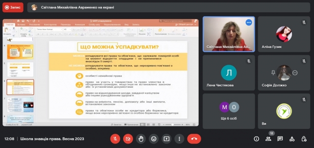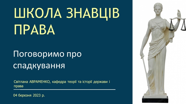 4 березня 2023 року учасники та учасниці просвітницького проєкту кафедри теорії та історії держави і права «Школа знавців права» зустрілися на черговій онлайн-зустрічі, що прослухати вебінар «Поговоримо про спадкування» від спікерки Світлани Авраменко.