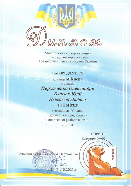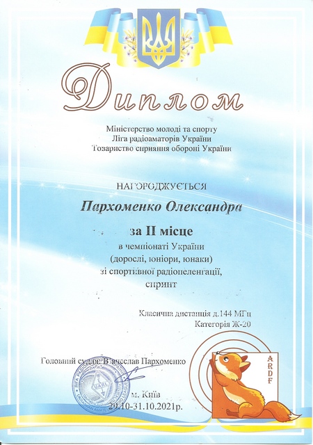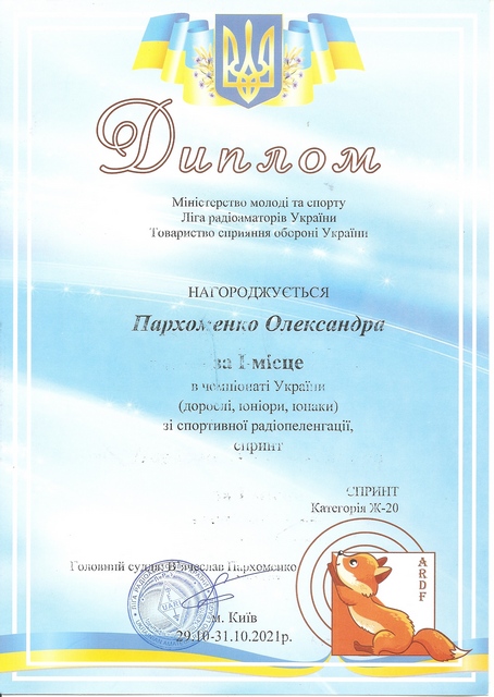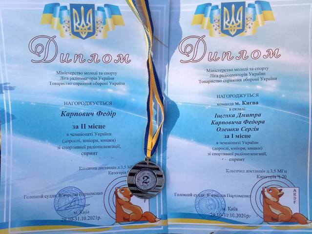 Федір Карпович і Олександра Пархоменко чемпіони України в дисципліні спринт на чемпіонаті України зі спортивної радіопеленгації «Спринт» серед дорослих, юніорів, юнаків, який відбувся 29-31 жовтня 2021 року у лісових масивах навколо Києва. Головний суддя чемпіонату України В’ячеслав Пархоменко – старший викладач кафедри фізичного виховання.