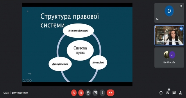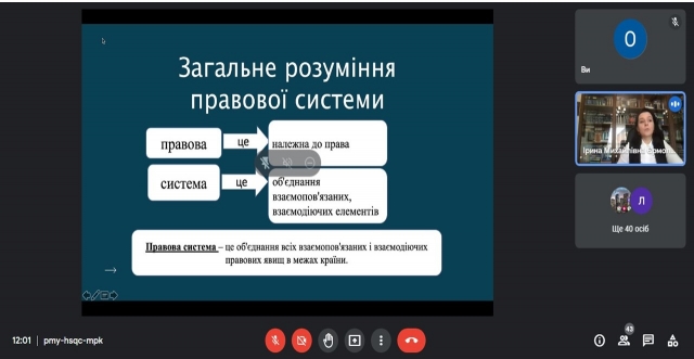 Спікерка заходу, доцентка кафедри теорії та історії держави і права Ірина Єрмоленко, передусім звернула увагу слухачів на те, що поняття правової системи є однією з центральних категорій правознавства. Розглянувши загальне розуміння поняття правової системи, вона перейшла до розгляду її різновидів, зупинившись на основних романо-германській, англосаксонській та мусульманській. У презентаційному матеріалі було показано і найсуттєвіші відмінності сучасних правових систем: романо-германська правова система базується на законі; англосаксонська – на судовому прецеденті; мусульманська – на приписах Корану.