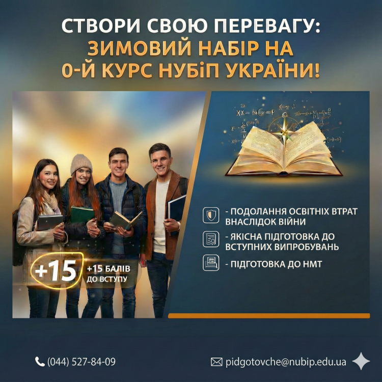 бонус до вступу: Ви отримаєте +15 додаткових балів до конкурсного балу при вступі до НУБіП України (на спеціальності з державною підтримкою).