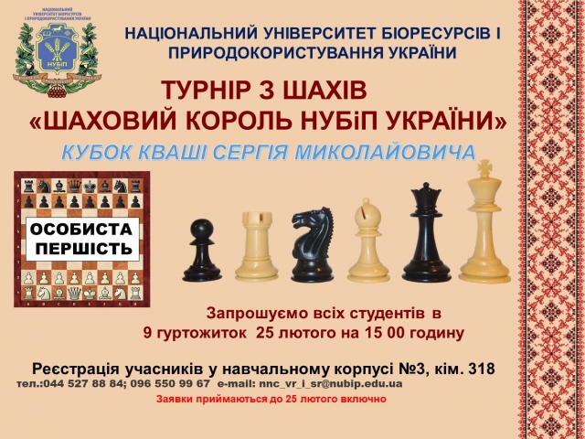 25.02.2020 року о 15:00, в гуртожитку № 9 стартує І етап шахового турніру серед студентів. Розпочинається боротьба за завання «Шаховий король НУБіП України» та головний приз Кубок Кваші Сергія Миколайовича.