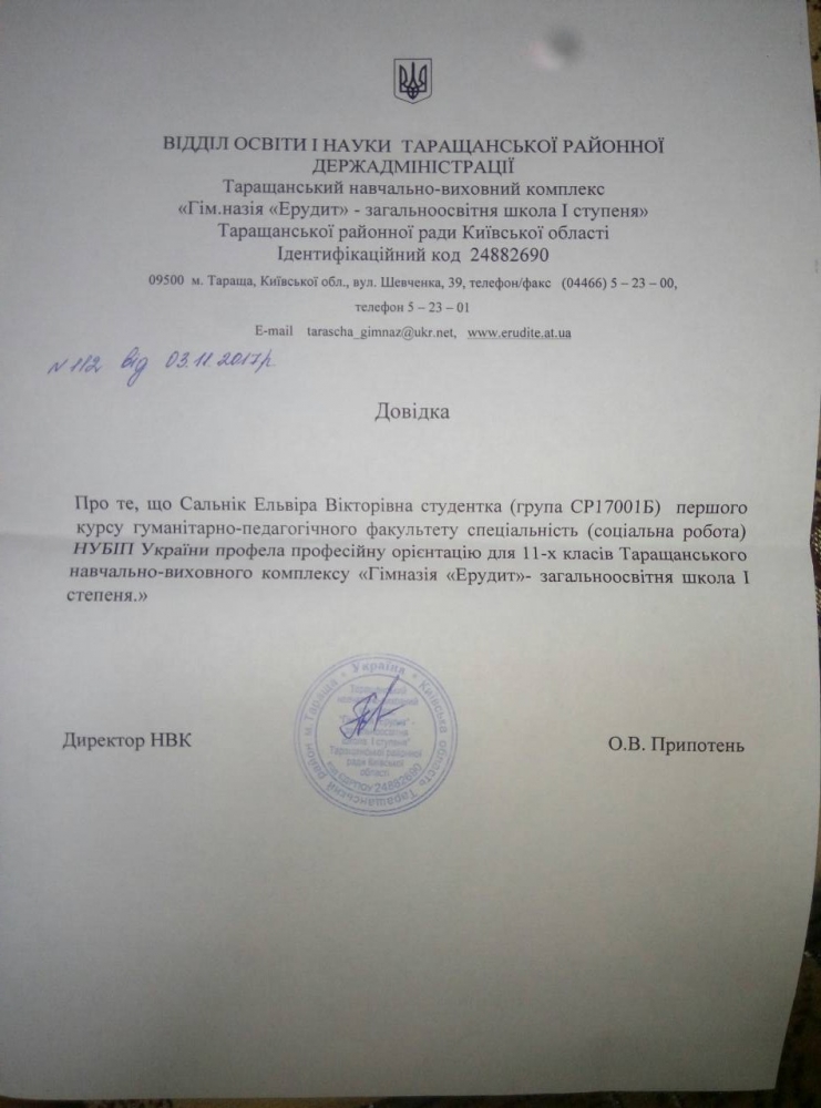 Студентка-першокурсниця гуманітарно-педагогічного факультету спеціальності «Соціальна робота» Ельвіра Сальник із профорієнтаційною метою відвідала рідний Таращанський навчально-виховний комплекс "Гімназія ""Ерудит" - загальноосвітня школа №1 ст. м. Тараща, Київська обл.