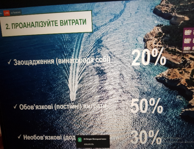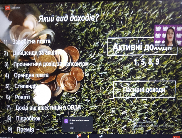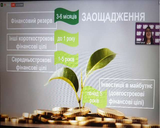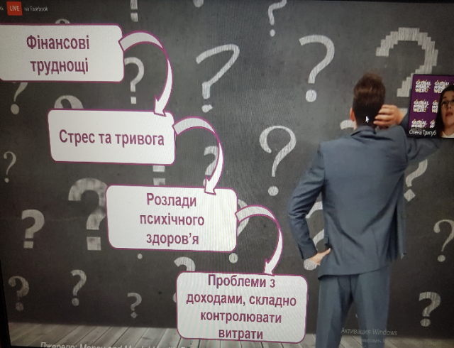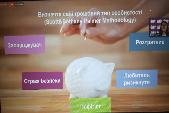 На вебінарі розглядалися питання фінансових труднощів, заощадження, контролю особистого капіталу тощо. Цікавим було питання, яке стосувалося, того, на скільки вистачить заощаджень при втраті доходу, а також визначення грошового типу особистості (заощаджувача, розтратника, любителя ризикувати, пофігиста, стража безпеки).