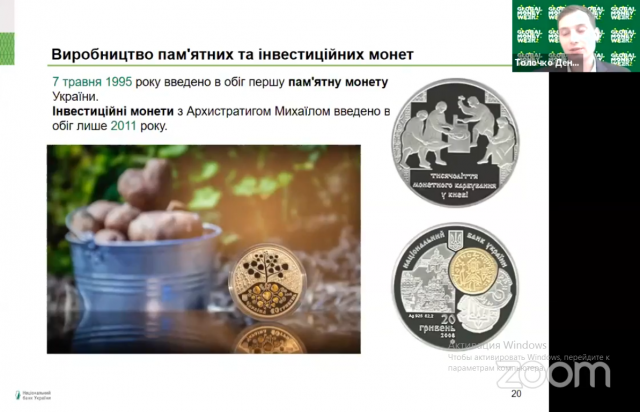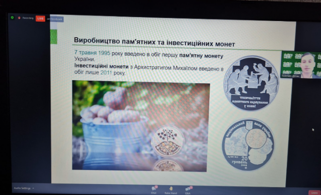 Учасники даних заходів дізналися про основні віхи у розвитку монетарної політики України, особливості збереження її цінової стабільності в часи глобальної невизначеності, дізналися про процес контролювання особистих фінансів. На вебінарах було задано безліч питань, які стосувалися інфляційних процесів у країні та шляхів їх подолання. Під час доповіді спікер зупинявся на передумовах переходу НБУ до режиму інфляційного таргетування, з метою проведення політики держави щодо зниження рівня інфляції та зростання ВВП. Студенти 1 курсу 6 групи ФАМ взяли участь у вебінарі “Як та коли виник Національний банк України?” Спікер – Денис Толочко, директор Музею грошей, Національний банк України. Учасники заходу познайомилися з історією становлення та розвитку банківської справи в Україні, дізналися історію виникнення НБУ й гривні та місце її виготовлення. Цікаво було почути інформацію про те, що перші гривні друкувалися не в Україні, а банкноти великих номіналів – в Англії, де був забезпечений найвищий їх захист. Друкарське кліше гривні було привезене в Україну у 1995 році, після чого було здійснено грошову реформу, згідно якої кожні 100000 купоно-карбованців підлягали обміну на 1 гривню. Спікер вебінару розповів про виготовлення пам’ятних монет, і наголосив, на першій – присвяченій копанню картоплі.