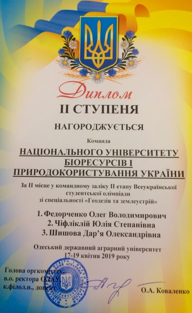 В результаті напруженої боротьби між учасниками ІІ-го етапу Всеукраїнської студентської олімпіади зі спеціальності 193 «Геодезія та землеустрій» студенти факультету землевпорядкування зайняли ІІ місце у командному заліку, отримавши диплом ІІ ступеня.