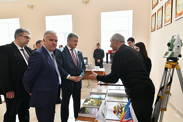Петро Порошенко ознайомився з науковим доробком нашої alma mater та відзначив роботу факультету землевпорядкування, спрямовану на створення геоінформаційно-картографічного забезпечення реалізації завдань земельної реформи, земельного кадастру, раціонального землекористування та охорони земель. Ці здобутки продемонстрував Президенту України доктор географічних наук, професор, завідувач кафедри геодезії та картографії, заступник декана факультету землевпорядкування, науковий керівник НДР, присвячених створенню цифрових великомасштабних Атласів земельних ресурсів адміністративних районів України, Атласу вартості земель України та Геоекологічних атласів річково-басейнових систем. Аналогів таких атласів в нашій державі немає.