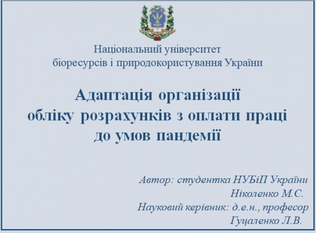 - Марії Ніколенко (студентки 4 курсу ОС «Бакалавр» спеціальності 071 «Облік і оподаткування» ОПП «Облік і аудит») на тему : «Адаптація організації обліку розрахунків з оплати праці до умов пандемії», науковий керівник – професор кафедри обліку та оподаткування Любов Гуцаленко.
