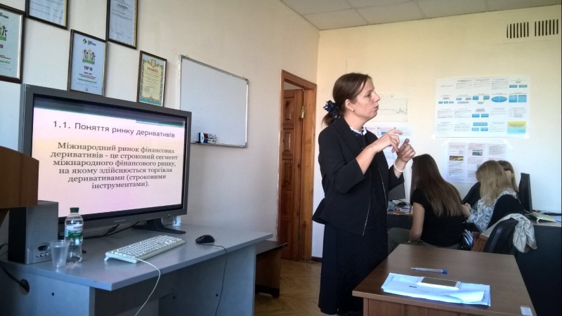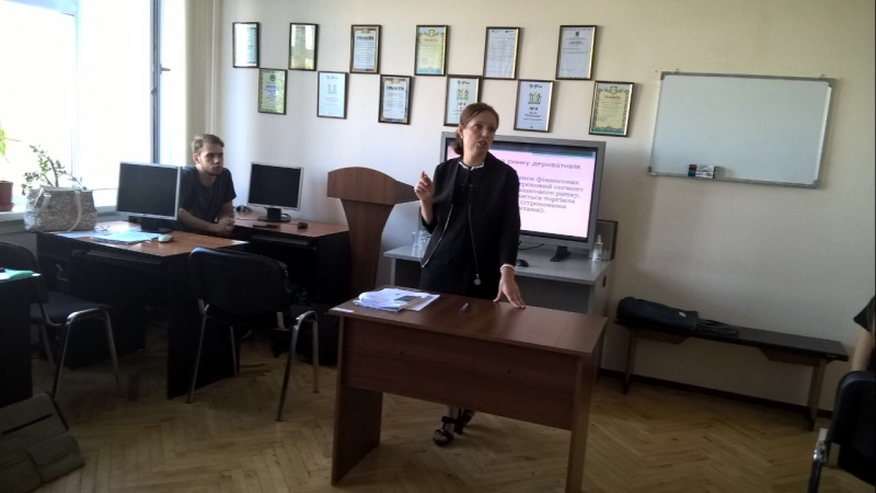 Друга половина дня була присв`ячена розгляду методичних та практичних питань, щодо викладання дисциплін «Фінансові деривативи» та «Аналіз і прогноз біржової кон`юнкутури». До роботи долучилися студенти НУБіП України. Доцент кафедри біржової діяльності і торгівлі Валентина Яворська, яка має багаторічний досвід викладання дисциплін біржового спрямування та практику стажування на світових біржових майданчиках, (зокрема Канзаській та Лондонській біржі), розповіла про реальний стан біржової торгівлі у світі та в Україні. Вона загострила увагу слухачів на розбіжностях в термінології щодо поняття «фінансовий дериватив» у зарубіжній та вітчизняній літературі; запропонувала ряд сучасних зарубіжних підручників, що влучно розкривають проблематику біржової торгівлі; та закликала до співпраці та спільних науково-методичних розробок.