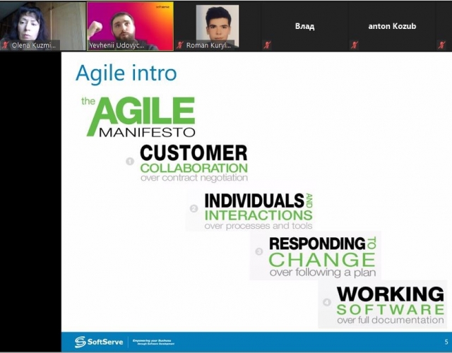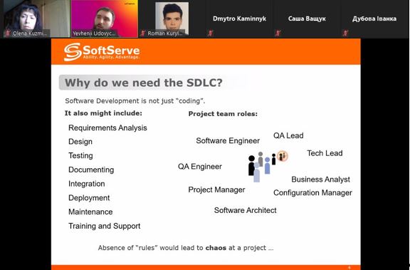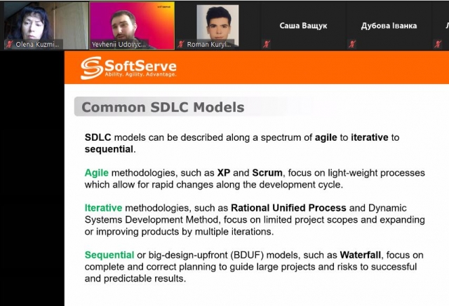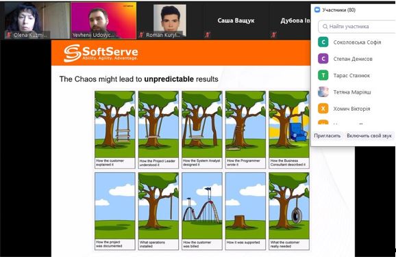Сьогоднішній вебінар мав ще одну особливість: до зустрічі представниками компанії SoftServe ми запросили й інших наших партнерів – учнів старших класів загальноосвітніх навчальних закладів. Відтак, зацікавлення розвитком ІТ-технологій об’єднало представників компанії SoftServe (досвідчених фахівців), студентів факультету інформаційних технологій (тих, хто лише розпочинає професійний розвиток), викладачів нашого факультету (тих, хто допомагає студентам стати успішними ІТ-ішниками) та старшокласників київського ліцею «Наукова зміна» та гімназії №172 «Нивки», а також Жашківської спеціалізованої школи №1 з поглибленим вивченням окремих предметів (майбутніх абітурієнтів). Більше того, до вебінару приєднались навіть батьки, бо краще один раз побачити, ніж сто раз прочитати на сайті рекламні пропозиції закладів вищої освіти.