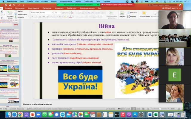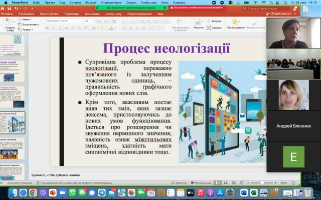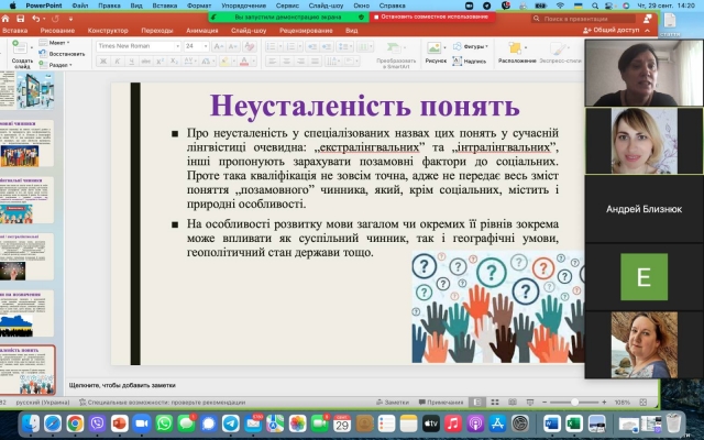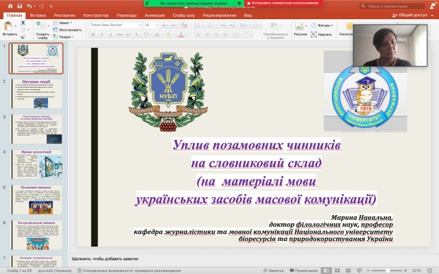 Професорка на матеріалі мови українських засобів масової комунікації продемонструвала вплив позамовних чинників на словниковий склад мови. Зокрема йшлося: про класифікації позамовних чинників в українському мовознавстві, про основні тенденції активізації тематичних груп у сучасних українських засобів масової інформації, а також про мовну адаптацію номінацій коронавірусних штамів у сучасних масмедіа та актуалізацію військової лексики в українських масмедіа.
