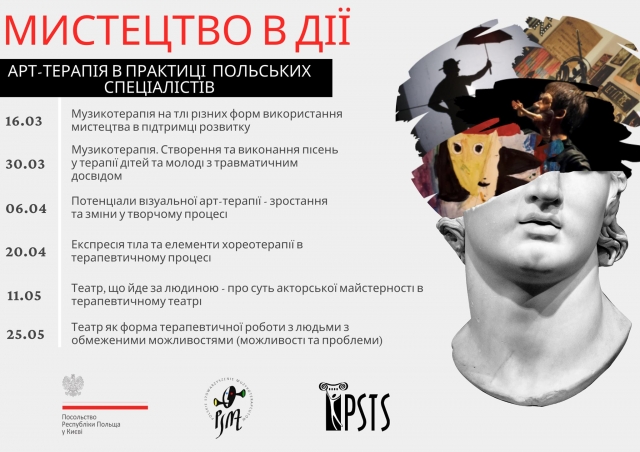 «Мистецтво в дії. Арт-терапія в практиці польських спеціалістів» – це серія онлайн-зустрічей, присвячених застосуванню художніх форм в терапевтичній діяльності, які проводитимуть польські викладачі та спеціалісти з багаторічним терапевтичним досвідом. Лекції присвячені можливостям та результатам застосування форм з галузі музикотерапії, терапії через художню творчість, хореотерапії та театротерапії під час роботи з дітьми та дорослими.