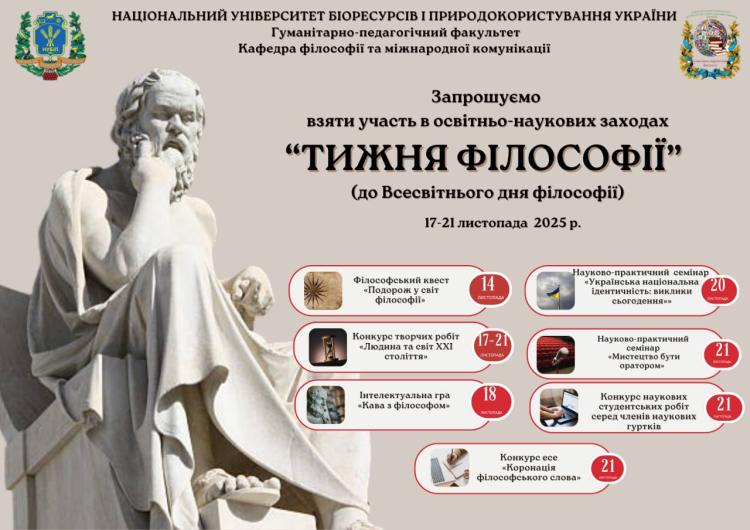 Кафедра філософії та міжнародної комунікації НУБІП України запрошує взяти участь в освітньо-наукових заходах в рамках проведення "Тижня філософії" до Всесвітнього дня філософії: