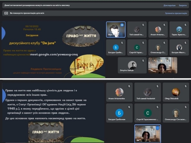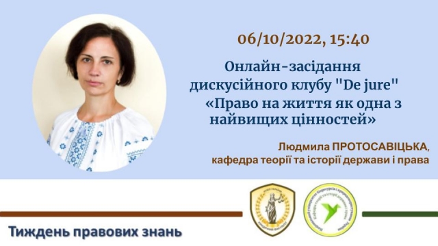 06 жовтня 2022 року в рамках Тижня правових знань-2022 відбулося засідання дискусійного клубу "De Jure!". Темою обговорення стало таке завжди цікаве й актуальне питання, як право на життя.