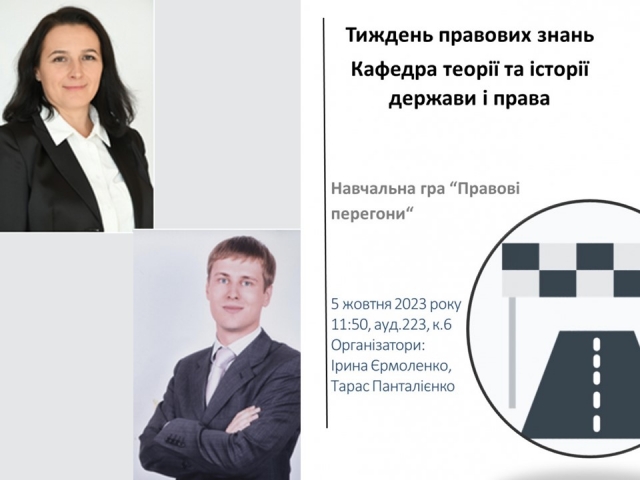 Тиждень правових знань у НУБіП України, анонсований кафедрою теорії та історії держави і права, завжди створює хвилюючу та приємну атмосферу серед викладачів та студентства. Не став винятком і його четвертий день. 05 жовтня 2023 р. дух позитивного суперництва відчули академічні групи 2303 (обрали назву «Тарасики») та 2304 (обрали назву «Прокуратура»), які і взяли активну участь у «Правових перегонах» під керівництвом Ірини Єрмоленко та Тараса Панталієнка.