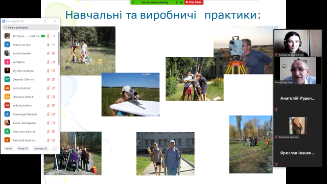 В цей сонячний день на платформі Zoom керівники ознайомчої практики – професор, завідувач кафедри геодезії та картографії І. П. Ковальчук та ас. кафедри геодезії та картографії К.А.Лук’янчук зібрали студентів 1 і 2 групи першого курсу факультету землевпорядкування на організаційну нараду. На ній студенти ознайомилися з Програмою практики, її завданнями, послідовністю їх виконання, сутністю професії землевпорядника, з видами документації стосовно обліку земельних ресурсів, видами землевпорядних робіт, дізналися чимало цікавого з історії виникнення та розвитку нашого університету, який 29 травня відсвяткував свій 122 рік від Дня заснування, про історію створення факультету землевпорядкування, його структуру, завдання у сфері підготовки фахівців за спеціальністю 193 «Геодезія та землеустрій», напрями дослідницької роботи, про грані професії землевпорядника. Впродовж цього тижня планується «відвідати» ДНВП «Картографія», ДП «Центр державного земельного кадастру», ДП «Київський науково-дослідний та проектний інститут землеустрою». Важливою складовою практики є виконання індивідуальних завдань кожним студентом і кожною студенткою та їх узагальнення у вигляді бригадних звітів, а на завершення – прилюдний захист виконаної роботи на завершальному етапі практики.