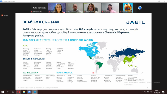 03.11.2021 - вебінар Ovostar Union з темою: Виробництво, що відповідає вимогам часу — нові технології та можливості. 04.11.2021 - вебінар ABInBev EFES з темою: Знайомство з компанією AB InBev Efes. 05.11.2021 - вебінар Jabil з темою: Управління проектами в реаліях сучасного виробництва. Просто - про складне. Кожен з учасників мав змогу по завершення кожного вебінару задати запитання доповідачу.