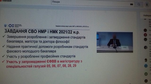 З доповіддю на тему «Завдання сектору вищої освітим НМР та НМК МОН України у 2021/22 н.р.» виступив Шаров О.І., генеральний директор директорату фахової передвищої, вищої освіти. Було розглянуто ряд актуальних питань, пов’язаних з стратегією подальшого розвитку вищої освіти в Україні.